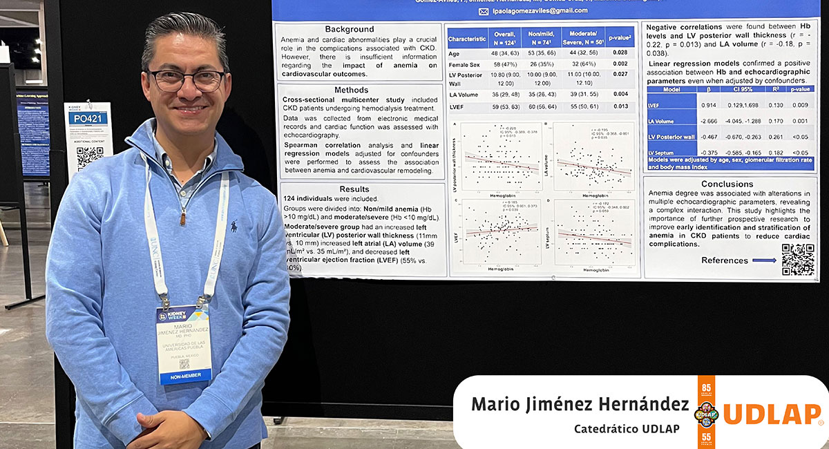 El Dr. Mario Jiménez Hernández, docente de la UDLAP, fue ponente invitado en el congreso anual de la American Society of Nephrology, realizado en San Diego, California, en donde presentó un trabajo de investigación colaborativo sobre el impacto de la anemia en los parámetros ecocardiográficos en pacientes asintomáticos con enfermedad renal crónica en hemodiálisis.