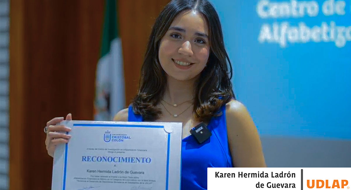 Karen Hermida Atracador de Guevara, egresada de excelencia de la concepción 2023 de la Estudios en Banca e Inversiones de la UDLAP, se hizo acreedora al Premio a la Mejor Conclusión de Alfabetización Financiera en México, otorgado por el Centro de Investigación en Alfabetización Financiera de la Universidad Cristóbal Colón.