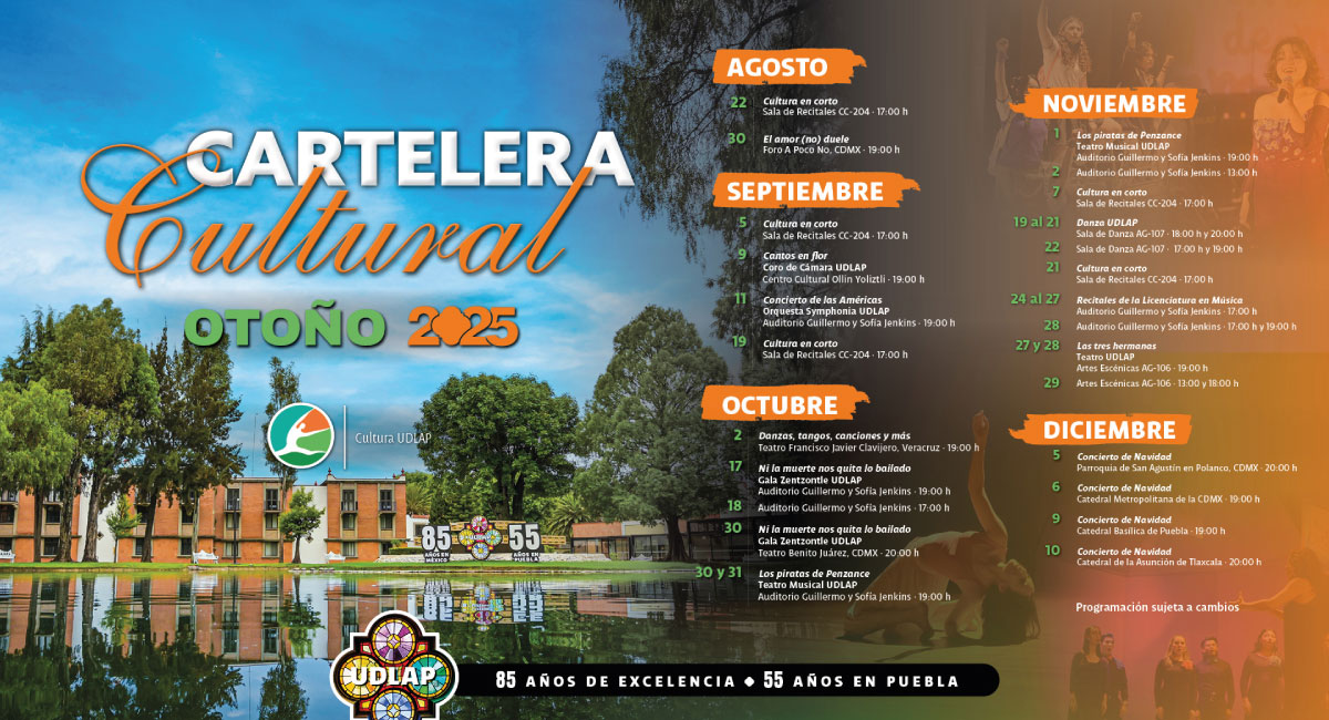 La Cartelera Cultural de la UDLAP correspondiente al semestre de Otoño 2025 contempla casi 30 actividades en escenarios locales y nacionales. Entre estos eventos se encuentran próximos a realizarse: Danzas, tangos, canciones y más en el Teatro Francisco Javier Clavijero en Veracruz, la vestidura de Zentzontle UDLAP Ni la crimen nos quita lo bailado, el musical Los piratas de Penzance, los tradicionales recitales de la Estudios en Música, una puesta en número por parte de Teatro UDLAP, así como la temporada de Conciertos de Navidad, que llegará a la Catedral Metropolitana de la Ciudad de México, la Catedral Fortificación de Puebla y la Catedral de Tlaxcala.