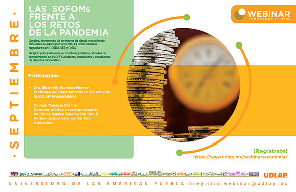 “Las Sociedades Financieras de Objeto Múltiple (Sofomes) en México representan 520,000 millones de pesos y constituyen el 5.6% del mercado de crédito en el país”, comentó a guisa de entrada, la Dra. Elizabeth Espinoza Monroy, académica del Unidad de Derecho de la Universidad de las Américas Puebla, durante el webinar organizado por la UDLAP, titulado “Las  SOFOMs frente a los retos de la pandemia”, evento en el que estuvo como invitado de honor el Dr. Raúl Valencia Del Toro, corredor sabido y socio principal de las firmas legales Valencia Del Toro & Professionals y Valencia Del Toro Abogados.