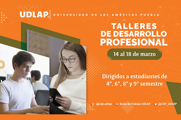 Del 14 al 18 de marzo de 2022, la Universidad de las Américas Puebla (UDLAP), a través de su Centro de Expansión Profesional (CDP), llevará a límite talleres de progreso profesional, actividad en recorrido dirigida a sus estudiantes que cursan el 4°, 6°, 8° y 9° semestre de carrera, con el fin de apoyar su inserción al mundo profesional.