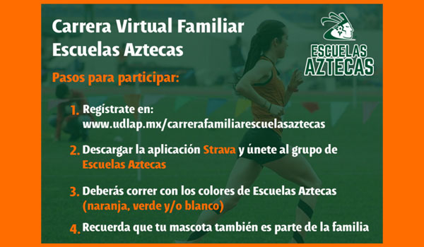 La dinámica de la carrera es recorrer kilómetros en conjunto, por relevos o individualmente e irlos registrando en la aplicación Strava, descargándola previo en su dispositivo móvil y uniéndose al conjunto de Escuelas Aztecas. Los participantes pueden designar independientemente su ruta, el ritmo y si desean caminar 3 o 5 k, valer 5 o 10 k o ir en bici 10 o 20 km y tendrán de las 6:00 horas del sábado 6 de marzo hasta las 18:00 horas del domingo, para compartir en la app sus marcas e imágenes tomadas en su camino.